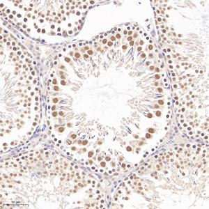 IHC检测ATXN7L3蛋白(货号 GB114096). 样品: 大鼠睾丸, 4%多聚甲醛 (货号G1101) 固定12-24小时. 抗原修复: 柠檬酸抗原修复液(干粉, pH 6.0) (G1201), 98℃, 20分钟. —抗: 1: 750稀释, 4℃ 孵育过夜. 二抗: HRP标记山羊抗兔IgG (H+L) (货号GB23303), 1: 200稀释, 室温孵育1小时. |