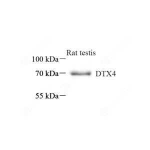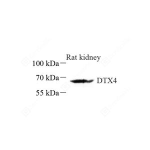 WB检测DTX4蛋白(货号 GB115387). 样品: 经RIPA裂解液(货号G2002)处理的蛋白质. 封闭: 封闭: 3%脱脂牛奶(货号GC310001)溶于TBST溶液, 室温孵育1小时. —抗: 1: 1500稀释, 4℃ 孵育过夜. 二抗: HRP标记山羊抗兔IgG (H+L) (货号GB23303), 1: 5000稀释, 室温孵育1小时. |