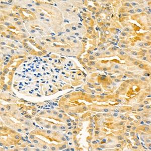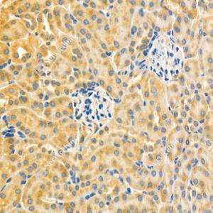 IHC检测FBXO4/FBX4蛋白(货号 GB114413). 样品: 大鼠肾, 4%多聚甲醛 (货号G1101) 固定12-24小时. 抗原修复: 柠檬酸抗原修复液(干粉, pH 6.0) (G1201), 98℃, 20分钟. —抗: 1: 1000稀释, 4℃ 孵育过夜. 二抗: HRP标记山羊抗兔IgG (H+L) (货号GB23303), 1: 200稀释, 室温孵育1小时. |
