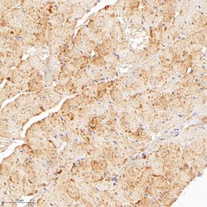 IHC检测HERC4蛋白(货号 GB114906). 样品: 大鼠心, 4%多聚甲醛 (货号G1101) 固定12-24小时. 抗原修复: Tris-EDTA抗原修复液 (pH 9.0) (G1203), 98℃, 20分钟. —抗: 1: 800稀释, 4℃ 孵育过夜. 二抗: HRP标记山羊抗兔IgG (H+L) (货号GB23303), 1: 200稀释, 室温孵育1小时. |