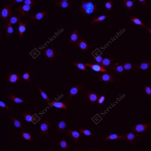 ICC检测HERC4蛋白(货号 GB114906)(红色). 样品: NIH-3T3细胞, 4%多聚甲醛 (货号G1101) 固定20分钟. 封闭: 3% BSA(货号GC305010)的PBS溶液, 室温孵育30分钟. —抗: 1: 200稀释, 4℃ 孵育过夜. 二抗: Cy3标记山羊抗兔IgG (H+L) (货号GB21303), 1: 300稀释, 室温孵育1小时. |