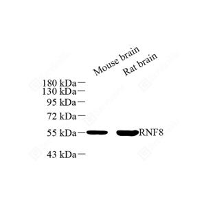 WB检测RNF8蛋白(货号 GB111158). 样品: 经RIPA裂解液(货号G2002)处理的蛋白质. 封闭: 封闭: 3%脱脂牛奶(货号GC310001)溶于TBST溶液, 室温孵育1小时. —抗: 1: 500稀释, 4℃ 孵育过夜. 二抗: HRP标记山羊抗兔IgG (H+L) (货号GB23303), 1: 5000稀释, 室温孵育1小时. |