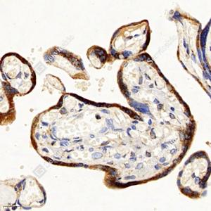 IHC检测Calumenin蛋白(货号 GB113694). 样品: 人胎盘, 4%多聚甲醛 (货号G1101) 固定12-24小时. 抗原修复: 柠檬酸抗原修复液(干粉, pH 6.0) (G1201), 98℃, 20分钟. —抗: 1: 500稀释, 4℃ 孵育过夜. 二抗: HRP标记山羊抗兔IgG (H+L) (货号GB23303), 1: 200稀释, 室温孵育1小时. |
