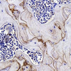 IHC检测Osteopontin蛋白(货号 GB11500). 样品: 小鼠骨, 4%多聚甲醛 (货号G1101) 固定12-24小时. 抗原修复: 柠檬酸抗原修复液(干粉, pH 6.0) (G1201), 98℃, 20分钟. —抗: 1: 1000稀释, 4℃ 孵育过夜. 二抗: HRP标记山羊抗兔IgG (H+L) (货号GB23303), 1: 200稀释, 室温孵育1小时. |