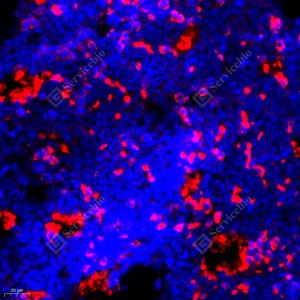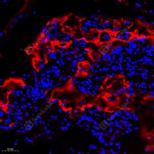 IF检测Osteopontin蛋白(货号 GB11500)(红色). 样品: 小鼠骨, 4%多聚甲醛 (货号G1101) 固定12-24小时. 抗原修复: Tris-EDTA抗原修复液(pH 9.0) (G1203), 98℃, 20分钟. 封闭: 3% BSA(货号GC305010)的PBS溶液, 室温孵育30分钟. —抗: 1: 500稀释, 4℃ 孵育过夜. 二抗: Cy3标记山羊抗兔IgG (H+L) (货号GB21303), 1: 300稀释, 室温孵育1小时. |