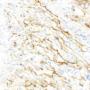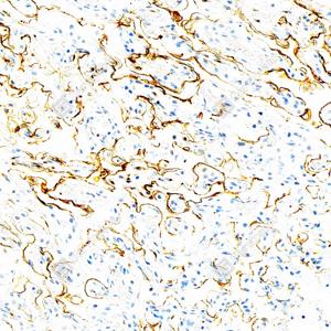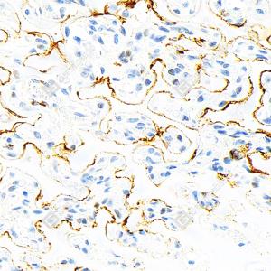 IHC检测Osteopontin蛋白(货号 GB122328). 样品: 大鼠股骨, 4%多聚甲醛 (货号G1101) 固定12-24小时. 抗原修复: 柠檬酸抗原修复液(干粉, pH 6.0) (G1201), 高压锅均匀喷气计时2分钟. —抗: 1: 700稀释, 4℃ 孵育过夜. 二抗: S-vision免疫组化多聚二抗(山羊抗小鼠), 即用型(货号G1301), 室温孵育20分钟. |