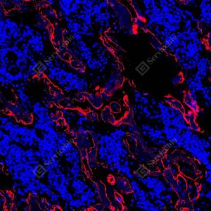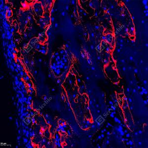 IF检测Osteopontin蛋白(货号 GB122328)(红色). 样品: 大鼠股骨, 4%多聚甲醛 (货号G1101) 固定12-24小时. 抗原修复: 柠檬酸抗原修复液(干粉, pH 6.0) (G1201), 高压锅均匀喷气计时2分钟. 封闭: 3% BSA(货号GC305010)的PBS溶液, 室温孵育30分钟. —抗: 1: 700稀释, 4℃ 孵育过夜. 二抗: Cy3标记山羊抗小鼠IgG (H+L) (货号GB21301), 1: 300稀释, 室温孵育1小时. |