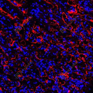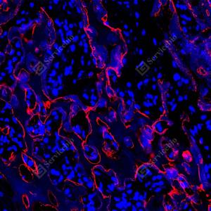 IF检测Osteopontin蛋白(货号 GB122328)(红色). 样品: 大鼠骨, 4%多聚甲醛 (货号G1101) 固定12-24小时. 抗原修复: 柠檬酸抗原修复液(干粉, pH 6.0) (G1201), 高压锅均匀喷气计时2分钟. 封闭: 3% BSA(货号GC305010)的PBS溶液, 室温孵育30分钟. —抗: 1: 700稀释, 4℃ 孵育过夜. 二抗: Cy3标记山羊抗小鼠IgG (H+L) (货号GB21301), 1: 300稀释, 室温孵育1小时. |