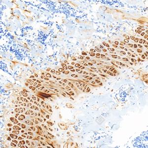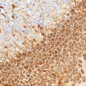 | IHC检测Aggrecan蛋白(货号 GB115753). 样品: 小鼠软骨, 4%多聚甲醛 (货号G1101) 固定12-24小时. 抗原修复: 柠檬酸抗原修复液(干粉, pH 6.0) (G1201), 98℃, 20分钟. —抗: 1: 1000稀释, 4℃ 孵育过夜. 二抗: S-vision免疫组化多聚二抗(山羊抗兔),即用型 (货号G1302), 室温孵育20分钟. |