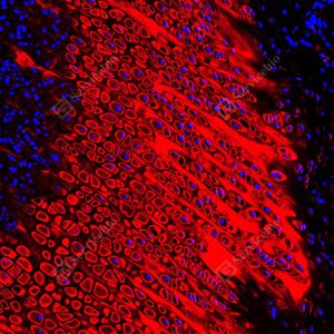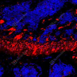 | IF检测Aggrecan蛋白(货号 GB115753)(红色). 样品: 小鼠骨, 4%多聚甲醛 (货号G1101) 固定12-24小时. 抗原修复: Tris-EDTA抗原修复液(pH 9.0) (G1203), 98℃, 20分钟. 封闭: 3% BSA(货号GC305010)的PBS溶液, 室温孵育30分钟. —抗: 1: 1000稀释, 4℃ 孵育过夜. 二抗: Cy3标记山羊抗兔IgG (H+L) (货号GB21303), 1: 300稀释, 室温孵育1小时. |