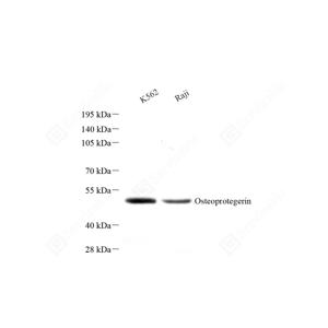 WB检测Osteoprotegerin蛋白(货号 GB113749). 样品: 经RIPA裂解液(货号G2002)处理的蛋白质. 封闭: 封闭: 3%脱脂牛奶(货号GC310001)溶于TBST溶液, 室温孵育1小时. —抗: 1: 500稀释, 4℃ 孵育过夜. 二抗: HRP标记山羊抗兔IgG (H+L) (货号GB23303), 1: 5000稀释, 室温孵育1小时. |