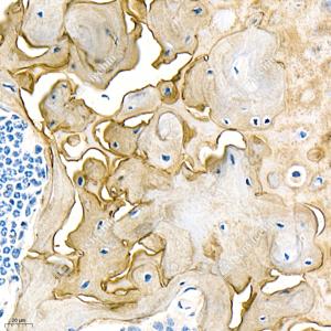 IHC检测Bone Sialoprotein蛋白(货号 GB11588). 样品: 小鼠骨, 4%多聚甲醛 (货号G1101) 固定12-24小时. 抗原修复: 柠檬酸抗原修复液(干粉, pH 6.0) (G1201), 98℃, 20分钟. —抗: 1: 500稀释, 4℃ 孵育过夜. 二抗: HRP标记山羊抗兔IgG (H+L) (货号GB23303), 1: 200稀释, 室温孵育1小时. |