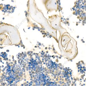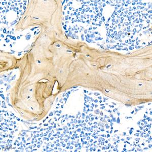 IHC检测Bone Sialoprotein蛋白(货号 GB11588). 样品: 小鼠骨, 4%多聚甲醛 (货号G1101) 固定12-24小时. 抗原修复: 柠檬酸抗原修复液(干粉, pH 6.0) (G1201), 98℃, 20分钟. —抗: 1: 1500稀释, 4℃ 孵育过夜. 二抗: HRP标记山羊抗兔IgG (H+L) (货号GB23303), 1: 200稀释, 室温孵育1小时. |
