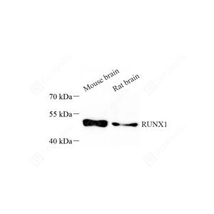 WB检测RUNX1/AML1蛋白(货号 GB115447). 样品: 经RIPA裂解液(货号G2002)处理的蛋白质. 封闭: 封闭: 3%脱脂牛奶(货号GC310001)溶于TBST溶液, 室温孵育1小时. —抗: 1: 800稀释, 4℃ 孵育过夜. 二抗: HRP标记山羊抗兔IgG (H+L) (货号GB23303), 1: 5000稀释, 室温孵育1小时. |