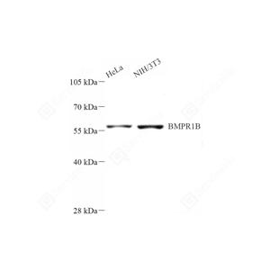 WB检测BMPR1B蛋白(货号 GB115499). 样品: 经RIPA裂解液(货号G2002)处理的蛋白质. 封闭: 封闭: 3%脱脂牛奶(货号GC310001)溶于TBST溶液, 室温孵育1小时. —抗: 1: 300稀释, 4℃ 孵育过夜. 二抗: HRP标记山羊抗兔IgG (H+L) (货号GB23303), 1: 5000稀释, 室温孵育1小时. |