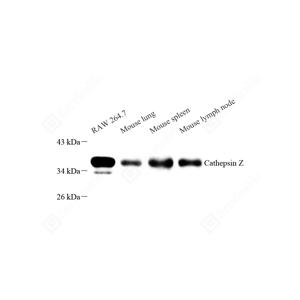 WB检测Cathepsin Z蛋白(货号 GB112171). 样品: 经RIPA裂解液(货号G2002)处理的蛋白质. 封闭: 3%脱脂牛奶(货号GC310001)溶于TBST溶液, 室温孵育1小时. —抗: 1: 1000稀释, 4℃ 孵育过夜. 二抗: HRP标记山羊抗兔IgG (H+L) (货号GB23303), 1: 5000稀释, 室温孵育1小时. |