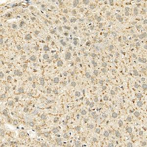 IHC检测Cathepsin Z蛋白(货号 GB112171). 样品: 小鼠肝, 4%多聚甲醛 (货号G1101) 固定12-24小时. 抗原修复: 柠檬酸抗原修复液(干粉, pH 6.0) (G1201), 98℃, 20分钟. —抗: 1: 600稀释, 4℃ 孵育过夜. 二抗: HRP标记山羊抗兔IgG (H+L) (货号GB23303), 1: 200稀释, 室温孵育1小时. |
