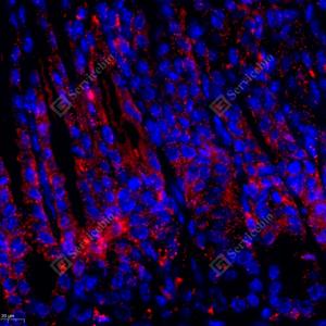 IF检测Cathepsin Z蛋白(货号 GB112171)(红色). 样品: 小鼠胃, 4%多聚甲醛 (货号G1101) 固定12-24小时. 抗原修复: Tris-EDTA抗原修复液(pH 9.0) (G1203), 98℃, 20分钟. 封闭: 3% BSA(货号GC305010)的PBS溶液, 室温孵育30分钟. —抗: 1: 600稀释, 4℃ 孵育过夜. 二抗: Cy3标记山羊抗兔IgG (H+L) (货号GB21303), 1: 300稀释, 室温孵育1小时. |
