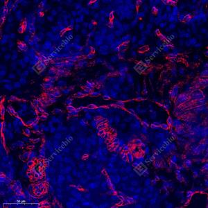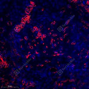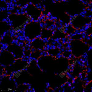 IF检测OMD蛋白(货号 GB113111)(红色). 样品: 大鼠肺, 4%多聚甲醛 (货号G1101) 固定12-24小时. 抗原修复: Tris-EDTA抗原修复液(pH 9.0) (G1203), 98℃, 20分钟. 封闭: 3% BSA(货号GC305010)的PBS溶液, 室温孵育30分钟. —抗: 1: 750稀释, 4℃ 孵育过夜. 二抗: Cy3标记山羊抗兔IgG (H+L) (货号GB21303), 1: 300稀释, 室温孵育1小时. |