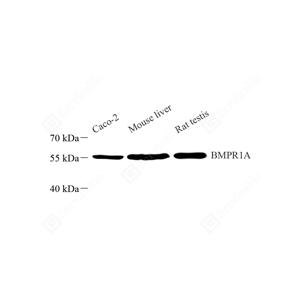 WB检测BMPR1A蛋白(货号 GB115448). 样品: 经RIPA裂解液(货号G2002)处理的蛋白质. 封闭: 封闭: 3%脱脂牛奶(货号GC310001)溶于TBST溶液, 室温孵育1小时. —抗: 1: 800稀释, 4℃ 孵育过夜. 二抗: HRP标记山羊抗兔IgG (H+L) (货号GB23303), 1: 5000稀释, 室温孵育1小时. |