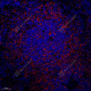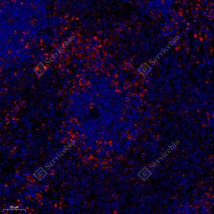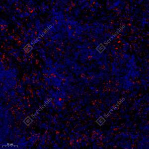 | IF检测TLR4蛋白(货号 GB11519)(红色). 样品: 大鼠脾, 4%多聚甲醛 (货号G1101) 固定12-24小时. 抗原修复: Tris-EDTA抗原修复液(pH 9.0) (G1203), 98℃, 20分钟. 封闭: 3% BSA(货号GC305010)的PBS溶液, 室温孵育30分钟. —抗: 1: 300稀释, 4℃ 孵育过夜. 二抗: Cy3标记山羊抗兔IgG (H+L) (货号GB21303), 1: 300稀释, 室温孵育1小时. |