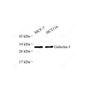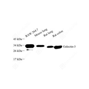 WB检测Galectin 3蛋白(货号 GB11940). 样品: 经RIPA裂解液(货号G2002)处理的蛋白质. 封闭: 封闭: 3%脱脂牛奶(货号GC310001)溶于TBST溶液, 室温孵育1小时. —抗: 1: 1000稀释, 4℃ 孵育过夜. 二抗: HRP标记山羊抗兔IgG (H+L) (货号GB23303), 1: 5000稀释, 室温孵育1小时. |
