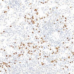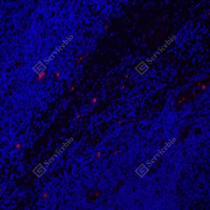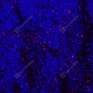 IF检测TLR2蛋白(货号 GB113378)(红色). 样品: 人扁桃体, 4%多聚甲醛 (货号G1101) 固定12-24小时. 抗原修复: Tris-EDTA抗原修复液(pH 9.0) (G1203), 98℃, 20分钟. 封闭: 3% BSA(货号GC305010)的PBS溶液, 室温孵育30分钟. —抗: 1: 600稀释, 4℃ 孵育过夜. 二抗: Cy3标记山羊抗兔IgG (H+L) (货号GB21303), 1: 300稀释, 室温孵育1小时. |