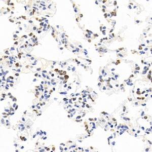 IHC检测TLR2蛋白(货号 GB113378). 样品: 小鼠脂多糖24小时肺, 4%多聚甲醛 (货号G1101) 固定12-24小时. 抗原修复: 柠檬酸抗原修复液(干粉, pH 6.0) (G1201), 98℃, 20分钟. —抗: 1: 650稀释, 4℃ 孵育过夜. 二抗: HRP标记山羊抗兔IgG (H+L) (货号GB23303), 1: 200稀释, 室温孵育1小时. |