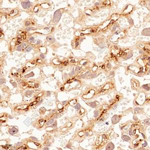 IHC检测Fragilis蛋白(货号 GB114087). 样品: 大鼠胎盘, 4%多聚甲醛 (货号G1101) 固定12-24小时. 抗原修复: 柠檬酸抗原修复液(干粉, pH 6.0) (G1201), 98℃, 20分钟. —抗: 1: 1600稀释, 4℃ 孵育过夜. 二抗: HRP标记山羊抗兔IgG (H+L) (货号GB23303), 1: 200稀释, 室温孵育1小时. |