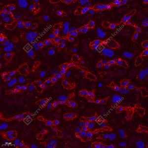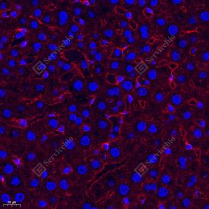IF检测Fragilis蛋白(货号 GB114087)(红色). 样品: 大鼠肝, 4%多聚甲醛 (货号G1101) 固定12-24小时. 抗原修复: Tris-EDTA抗原修复液(pH 9.0) (G1203), 98℃, 20分钟. 封闭: 3% BSA(货号GC305010)的PBS溶液, 室温孵育30分钟. —抗: 1: 1600稀释, 4℃ 孵育过夜. 二抗: Cy3标记山羊抗兔IgG (H+L) (货号GB21303), 1: 300稀释, 室温孵育1小时. |