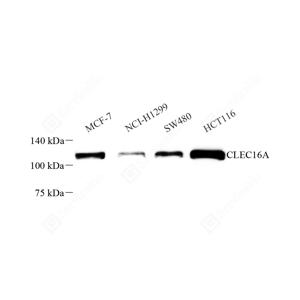 WB检测CLEC16A蛋白(货号 GB111588). 样品: 经RIPA裂解液(货号G2002)处理的蛋白质. 封闭: 封闭: 3%脱脂牛奶(货号GC310001)溶于TBST溶液, 室温孵育1小时. —抗: 1: 500稀释, 4℃ 孵育过夜. 二抗: HRP标记山羊抗兔IgG (H+L) (货号GB23303), 1: 5000稀释, 室温孵育1小时. |