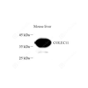 WB检测COLEC11蛋白(货号 GB115040). 样品: 经RIPA裂解液(货号G2002)处理的蛋白质. 封闭: 3%脱脂牛奶(货号GC310001)溶于TBST溶液, 室温孵育1小时. —抗: 1: 2000稀释, 4℃ 孵育过夜. 二抗: HRP标记山羊抗兔IgG (H+L) (货号GB23303), 1: 5000稀释, 室温孵育1小时. |