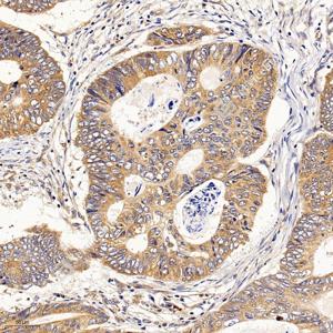 IHC检测IFIT5蛋白(货号 GB111810). 样品: 人结肠癌, 4%多聚甲醛 (货号G1101) 固定12-24小时. 抗原修复: 柠檬酸抗原修复液(干粉, pH 6.0) (G1201), 98℃, 20分钟. —抗: 1: 500稀释, 4℃ 孵育过夜. 二抗: HRP标记山羊抗兔IgG (H+L) (货号GB23303), 1: 200稀释, 室温孵育1小时. |