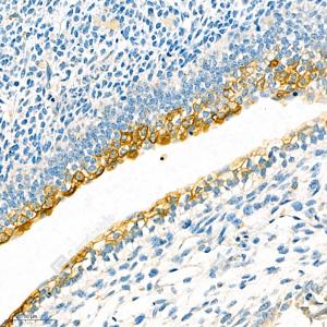 IHC检测IFIT5蛋白(货号 GB111810). 样品: 小鼠胚胎小鼠, 4%多聚甲醛 (货号G1101) 固定12-24小时. 抗原修复: 柠檬酸抗原修复液(干粉, pH 6.0) (G1201), 98℃, 20分钟. —抗: 1: 300稀释, 4℃ 孵育过夜. 二抗: HRP标记山羊抗兔IgG (H+L) (货号GB23303), 1: 200稀释, 室温孵育1小时. |