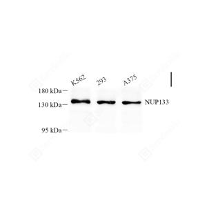 WB检测NUP133蛋白(货号 GB112694). 样品: 经RIPA裂解液(货号G2002)处理的蛋白质. 封闭: 3%脱脂牛奶(货号GC310001)溶于TBST溶液, 室温孵育1小时. —抗: 1: 1000稀释, 4℃ 孵育过夜. 二抗: HRP标记山羊抗兔IgG (H+L) (货号GB23303), 1: 5000稀释, 室温孵育1小时. |