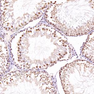 IHC检测NUP133蛋白(货号 GB112694). 样品: 小鼠睾丸, 4%多聚甲醛 (货号G1101) 固定12-24小时. 抗原修复: 柠檬酸抗原修复液(干粉, pH 6.0) (G1201), 98℃, 20分钟. —抗: 1: 4800稀释, 4℃ 孵育过夜. 二抗: HRP标记山羊抗兔IgG (H+L) (货号GB23303), 1: 200稀释, 室温孵育1小时. |