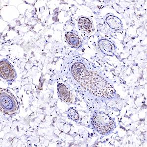 IHC检测NUP133蛋白(货号 GB112694). 样品: 大鼠皮肤, 4%多聚甲醛 (货号G1101) 固定12-24小时. 抗原修复: 柠檬酸抗原修复液(干粉, pH 6.0) (G1201), 98℃, 20分钟. —抗: 1: 800稀释, 4℃ 孵育过夜. 二抗: HRP标记山羊抗兔IgG (H+L) (货号GB23303), 1: 200稀释, 室温孵育1小时. |