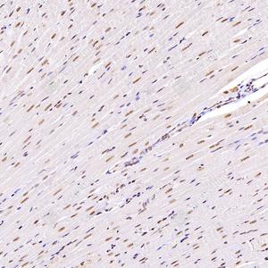 IHC检测NUP133蛋白(货号 GB112694). 样品: 大鼠心, 4%多聚甲醛 (货号G1101) 固定12-24小时. 抗原修复: 柠檬酸抗原修复液(干粉, pH 6.0) (G1201), 98℃, 20分钟. —抗: 1: 800稀释, 4℃ 孵育过夜. 二抗: HRP标记山羊抗兔IgG (H+L) (货号GB23303), 1: 200稀释, 室温孵育1小时. |