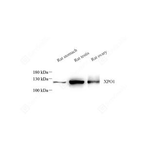 WB检测CRM1蛋白(货号 GB113990). 样品: 经RIPA裂解液(货号G2002)处理的蛋白质. 封闭: 封闭: 3%脱脂牛奶(货号GC310001)溶于TBST溶液, 室温孵育1小时. —抗: 1: 3000稀释, 4℃ 孵育过夜. 二抗: HRP标记山羊抗兔IgG (H+L) (货号GB23303), 1: 5000稀释, 室温孵育1小时. |