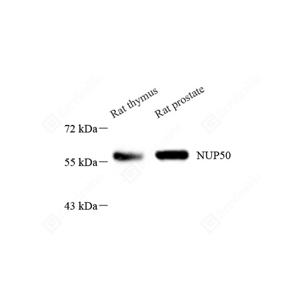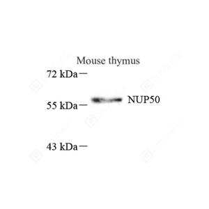 Nup50 (also known as Npap60) is a nucleoporin that binds directly to importin α and their interaction plays an important role in nuclear import. Nup50 is a mobile nucleoporin localized primarily in the nuclear basket of the nuclear pore complex (NPC) and in the nucleoplasm. Human Nup50 has two isoforms: Npap60L (1-469 aa), and its alternatively spliced isoform, Npap60S (29-469 aa) of Npap60L. This antibody recognizes both of two isoforms.