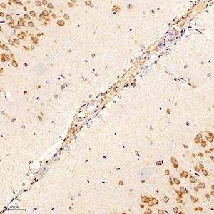 IHC检测RACK1蛋白(货号 GB11909). 样品: 小鼠脑, 4%多聚甲醛 (货号G1101) 固定12-24小时. 抗原修复: 柠檬酸抗原修复液(干粉, pH 6.0) (G1201), 98℃, 20分钟. —抗: 1: 1200稀释, 4℃ 孵育过夜. 二抗: HRP标记山羊抗兔IgG (H+L) (货号GB23303), 1: 200稀释, 室温孵育1小时. |