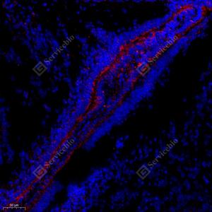 IF检测RACK1蛋白(货号 GB11909)(绿色). 样品: 小鼠胎脑, 4%多聚甲醛 (货号G1101) 固定12-24小时. 抗原修复: Tris-EDTA抗原修复液(pH 9.0) (G1203), 98℃, 20分钟. 封闭: 3% BSA(货号GC305010)的PBS溶液, 室温孵育30分钟. —抗: 1: 1000稀释, 4℃ 孵育过夜. 二抗: Alexa Fluor 488标记山羊抗兔IgG (H+L) (货号GB25303), 1: 400稀释, 室温孵育1小时. |