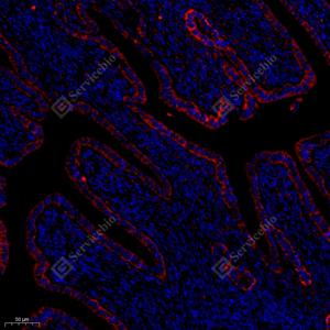 IF检测RACK1蛋白(货号 GB11909)(绿色). 样品: 小鼠子宫, 4%多聚甲醛 (货号G1101) 固定12-24小时. 抗原修复: Tris-EDTA抗原修复液(pH 9.0) (G1203), 98℃, 20分钟. 封闭: 3% BSA(货号GC305010)的PBS溶液, 室温孵育30分钟. —抗: 1: 1000稀释, 4℃ 孵育过夜. 二抗: Alexa Fluor 488标记山羊抗兔IgG (H+L) (货号GB25303), 1: 400稀释, 室温孵育1小时. |