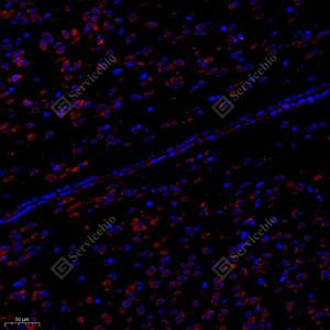 IF检测RACK1蛋白(货号 GB11909)(绿色). 样品: 大鼠纹状体, 4%多聚甲醛 (货号G1101) 固定12-24小时. 抗原修复: Tris-EDTA抗原修复液(pH 9.0) (G1203), 98℃, 20分钟. 封闭: 3% BSA(货号GC305010)的PBS溶液, 室温孵育30分钟. —抗: 1: 1000稀释, 4℃ 孵育过夜. 二抗: Alexa Fluor 488标记山羊抗兔IgG (H+L) (货号GB25303), 1: 400稀释, 室温孵育1小时. |
