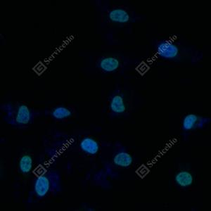 ICC检测RACK1蛋白(货号 GB11909)(绿色). 样品: Hela细胞, 4%多聚甲醛 (货号G1101) 固定20分钟. 封闭: 3% BSA(货号GC305010)的PBS溶液, 室温孵育30分钟. 一抗: 1: 100稀释, 4℃ 孵育过夜. 二抗: Alexa Fluor 488标记山羊抗兔IgG (H+L) (货号GB25303), 1: 400稀释, 室温孵育1小时. |