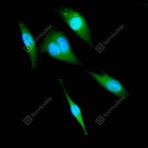 ICC检测RACK1蛋白(货号 GB11909)(绿色). 样品: NIH-3T3细胞, 4%多聚甲醛 (货号G1101) 固定20分钟. 封闭: 3% BSA(货号GC305010)的PBS溶液, 室温孵育30分钟. 一抗: 1: 100稀释, 4℃ 孵育过夜. 二抗: Alexa Fluor 488标记山羊抗兔IgG (H+L) (货号GB25303), 1: 400稀释, 室温孵育1小时. |