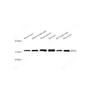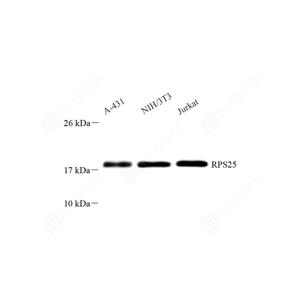 WB检测RPS25蛋白(货号 GB112141). 样品: 经RIPA裂解液(货号G2002)处理的蛋白质. 封闭: 3%脱脂牛奶(货号GC310001)溶于TBST溶液, 室温孵育1小时. —抗: 1: 1000稀释, 4℃ 孵育过夜. 二抗: HRP标记山羊抗兔IgG (H+L) (货号GB23303), 1: 5000稀释, 室温孵育1小时. |