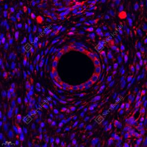 IF检测RPS25蛋白(货号 GB112141)(红色). 样品: 大鼠子宫, 4%多聚甲醛 (货号G1101) 固定12-24小时. 抗原修复: Tris-EDTA抗原修复液(pH 9.0) (G1203), 98℃, 20分钟. 封闭: 3% BSA(货号GC305010)的PBS溶液, 室温孵育30分钟. —抗: 1: 1500稀释, 4℃ 孵育过夜. 二抗: Cy3标记山羊抗兔IgG (H+L) (货号GB21303), 1: 300稀释, 室温孵育1小时. |