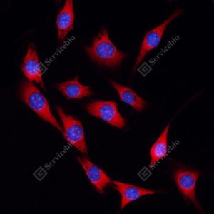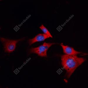 ICC检测RPS25蛋白(货号 GB112141)(红色). 样品: NIH-3T3细胞, 4%多聚甲醛 (货号G1101) 固定20分钟. 封闭: 3% BSA(货号GC305010)的PBS溶液, 室温孵育30分钟. 一抗: 1: 100稀释, 4℃ 孵育过夜. 二抗: Cy3标记山羊抗兔IgG (H+L) (货号GB21303), 1: 300稀释, 室温孵育1小时. |