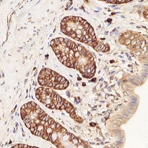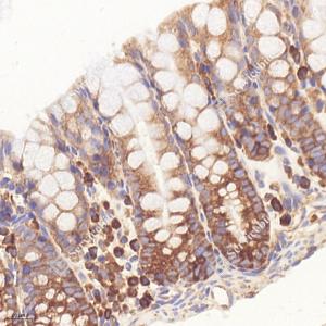 IHC检测RPL10蛋白(货号 GB113267). 样品: 小鼠直肠, 4%多聚甲醛 (货号G1101) 固定12-24小时. 抗原修复: 柠檬酸抗原修复液(干粉, pH 6.0) (G1201), 98℃, 20分钟. —抗: 1: 1200稀释, 4℃ 孵育过夜. 二抗: HRP标记山羊抗兔IgG (H+L) (货号GB23303), 1: 200稀释, 室温孵育1小时. |
